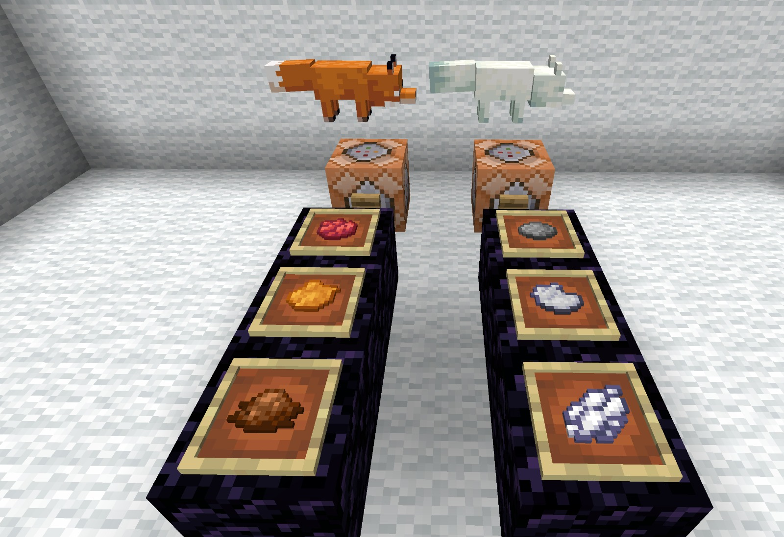 Da viele Tiere (Frösche, Katzen, Hühner, Kühe, Füchse, Schweine, Wölfe) biomabhängige Varianten haben welche nicht durch Spawneggs erzeugt werden können können diese mit Farbstoffen "eingefärbt" werden. Mit Shift + Rechtsklick und dem Farbitem kann das Tier eingefärbt werden.